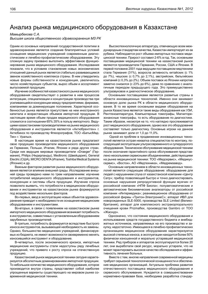 Современное состояние медицинского оборудования в Казахстане